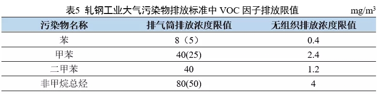 本標(biāo)準(zhǔn)包括在鋼材表面涂鍍金屬或非金屬的涂、鍍層鋼材的加工過(guò)程,因此類生產(chǎn)工藝過(guò)程中有揮發(fā)性有機(jī)物的排放,因此涉及揮發(fā)性有機(jī)物排放限值要求。括號(hào)內(nèi)代表特別排放限值,下同。